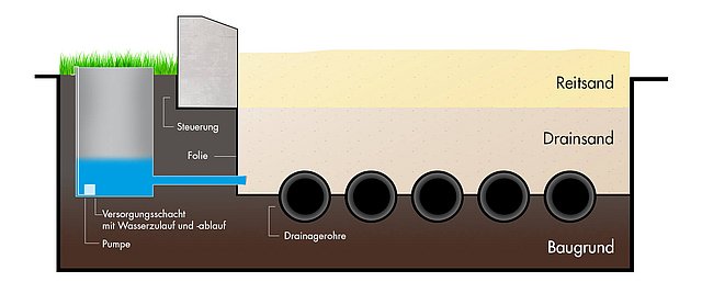Der Ebbe Flut Reitplatz reguliert die Feuchtigkeit Ihres Reitbodens, sodass dieser an die jeweiligen Erfordernisse angepasst werden kann.