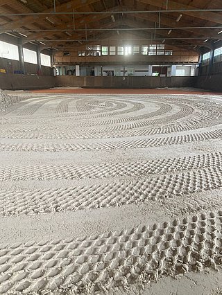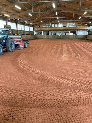 Reithallenboden Voltgier-und Reitverein Arpke, hier wurde die alte Tretschicht ausgebaut, der Baugrund nivelliert, eine Trennschicht aus Ziegelsand eingebaut, in die hochwertige Tretschicht aus Fein-Quarzsand wurden unsere Natur-Vlieshäcksel aus Schafwolle eingemischt