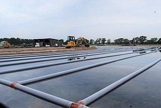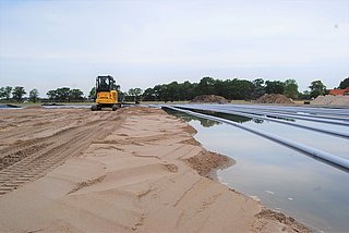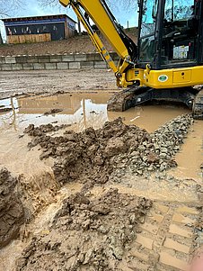 Start des 2.850 m² grossen Ebbe-Flut-System als 2 Schicht-System, bei widrigen Wetter-Verhältnissen. Zur Zeit muss noch das angestaute Regenwasser aus der Fläche "geflutet" werden