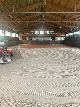 Reithalle 20 x 60, Sanierung Reitboden mit neuer Quarzsand-Tretschicht und Naturvlieshäcksel Viskose