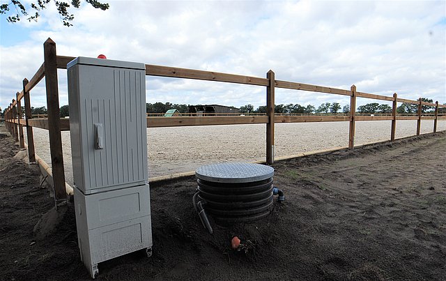 Die Funktionstüchtigkeit des Ebbe-Flut-Systems hat sich nach den ersten Regenfällen schon bewiesen. Das in die Zisterne abgeleitete Regenwasser von den Dächern der Reithalle und den Stallungen, konnte in einer Trockenphase den Ebbe-Flut Reitplatz bereits bewässern und einige Tage später, nach heftigen Regengüssen , nun auch überschüssige und abgepumpte Wasser aus dem Reitplatz ( neben dem Dachwasser) der Zisterne zurückgeführt werden